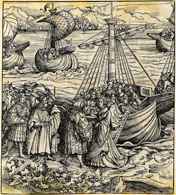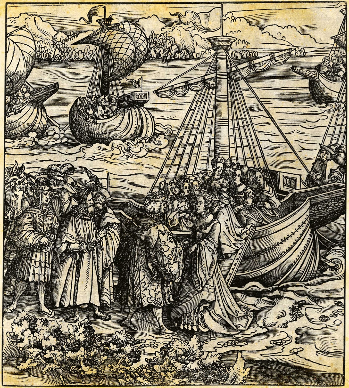 Sobre estas líneas, grabado de Der Weiss Kunig (El Rey Blanco), biografía del emperador Maximiliano I. La imagen muestra la llegada de Juana de Castilla al puerto flamenco de Arnemuiden en 1497.
