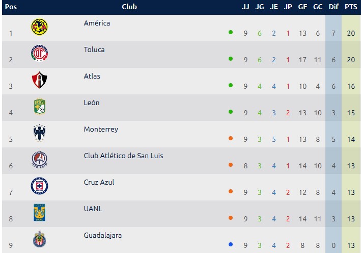 Aquí las estadísticas de la jornada # 9 de la LIGA MX – Torneo Apertura 2021, con el goleador del torneo, la tabla general en la que ahora Toluca comparte el primer lugar con América que el sábado perdió el invicto, también la próxima jornada y lo mejor de la semana.